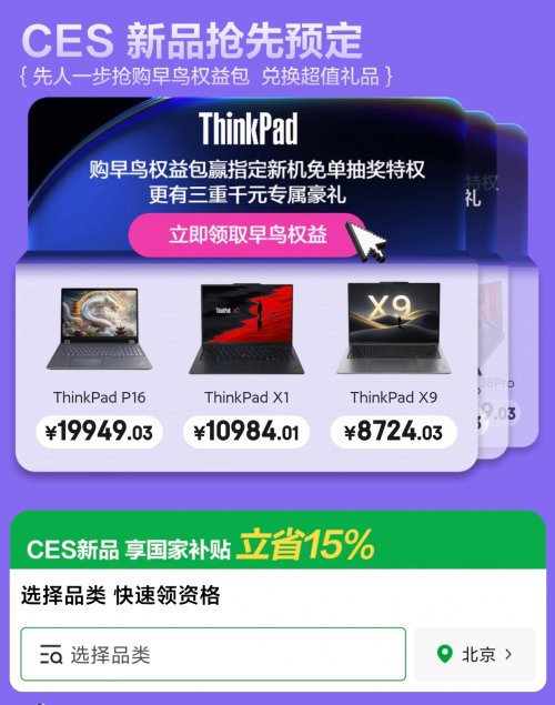 活动期间,用户可在京东购买 CES 新品的「1 元重磅早鸟权益包」,成功购买并登记后,可获得包含实用键盘鼠标、京东 E 卡及电脑双肩包等在内的超值好礼。其中,购买 ThinkPad、雷神、机械师、华硕指定 2026 年新品,还可享专属早鸟权益:购买 ThinkPad 指定机型可参与抽免单大奖,并获赠 LTE 无线伴侣、thinkplus 140W 锋行者电源及五年无忧保;购买雷神、机械师指定新款电脑可享抽五折、抽 2000 元 E 卡特权,送鼠垫套装;购买 Intel 新品华硕无畏 Pro16,则可于新品上市后凭早鸟权益领取四重好礼,含价值 288 元咪咕会员卡、20 元京东 E 卡、华硕都市背包及 a 豆无线鼠标。