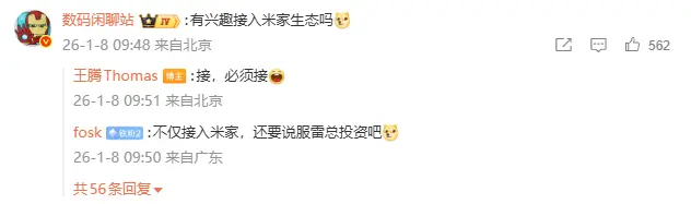 1月8日,原小米中国区市场部总经理、REDMI 品牌总经理王腾在微博发长文宣布,自己筹备创业的新公司“今日宜休”已成立,并在微博评论区回复了部分网友的问题。博主@数码闲聊站询问王腾:“有兴趣接入米家生态吗?”,王腾答道:“接,必须接”。