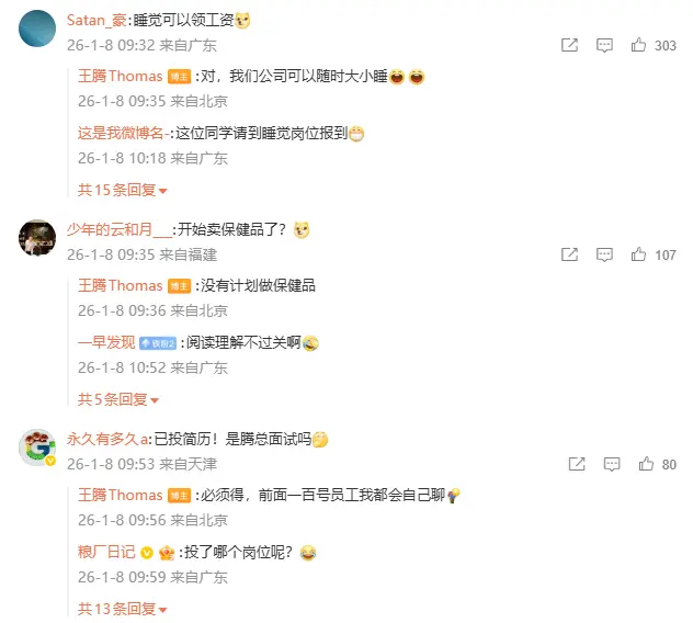 有网友询问新公司招聘相关问题,王腾回应称“前一百号员工我都会自己聊”。另有网友建议开发针对“睡眠瘫痪症”的监测与提醒功能,王腾回复“收到”。