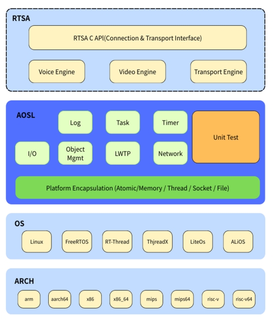 AOSL是一个由声网发起并完全开源的标准项目,已在 GitHub 开放共享。它通过定义操作系统、芯片与RTC传输层之间的通用接口,有效屏蔽了不同芯片和操作系统之间的底层差异,让开发者能够专注于应用层创新,而无需适配复杂的硬件与系统碎片化问题,尤其为 RTOS 等嵌入式场景提供了统一支持。