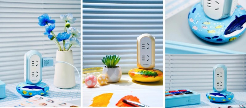 妙莱还推出了可拆卸的彩色安全塞,既能封闭闲置插孔防尘,又能通过自由组合插孔位置,让用户发挥创意打造个性化造型。底座还可以涂鸦绘画,让每一个妙莱插排都成为独一无二的艺术品。