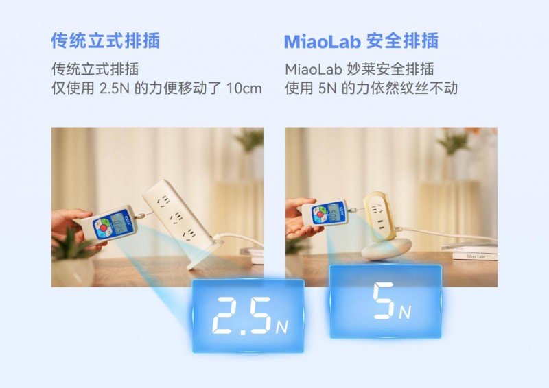 图1:传统插排倾倒后,极易引发触电危险;而妙莱不倒翁插排则能稳固站立,杜绝此类隐患。