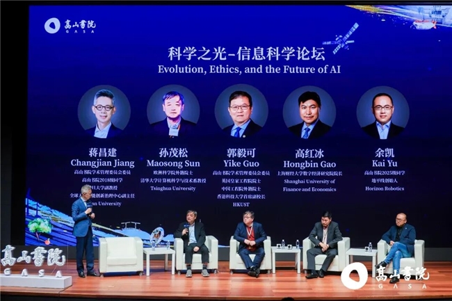 下午的信息科学论坛中,郭毅可院士与欧洲科学院外籍院士、清华大学计算机科学与技术系教授孙茂松,上海财经大学数字经济研究院院长高红冰,高山书院2025级同学、地平线创始人余凯等嘉宾就AI的第一性原理展开博弈。嘉宾们一致认为,AI正引发人类历史上最深刻的生产力变革,人类需要主动与AI共同进化,而非被动替代。