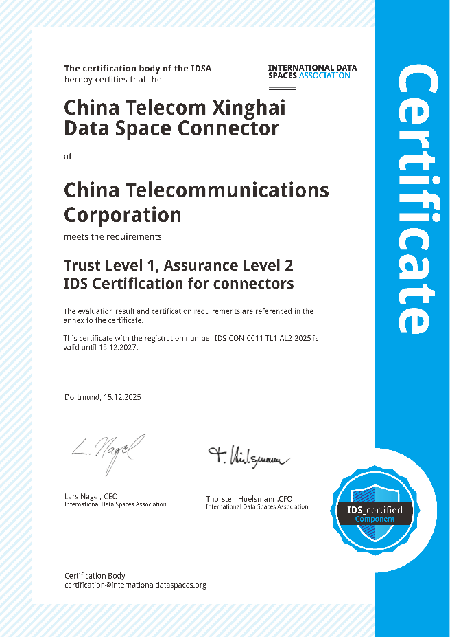 中国电信星海数据空间连接器获得国际数据空间(IDS)认证