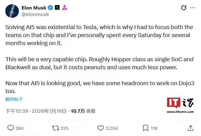 1 月 19 日消息,埃隆 · 马斯克刚刚在 X 平台对旗下企业特斯拉的下代人工智能芯片 AI5 发布了进一步的看法,表示 AI5 在单 SoC 下的性能与英伟达 Hopper 相近、双 SoC 配置则能媲美英伟达 Blackwell,同时拥有更低的成本和价格。