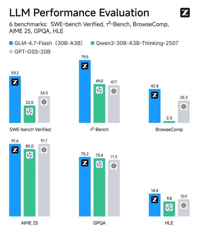 在 SWE-bench Verified、τ²-Bench 等主流基准测试中,GLM-4.7-Flash 的综合表现超过 gpt-oss-20b、Qwen3-30B-A3B-Thinking-2507,在相同和近似尺寸模型系列中取得开源 SOTA 分数。