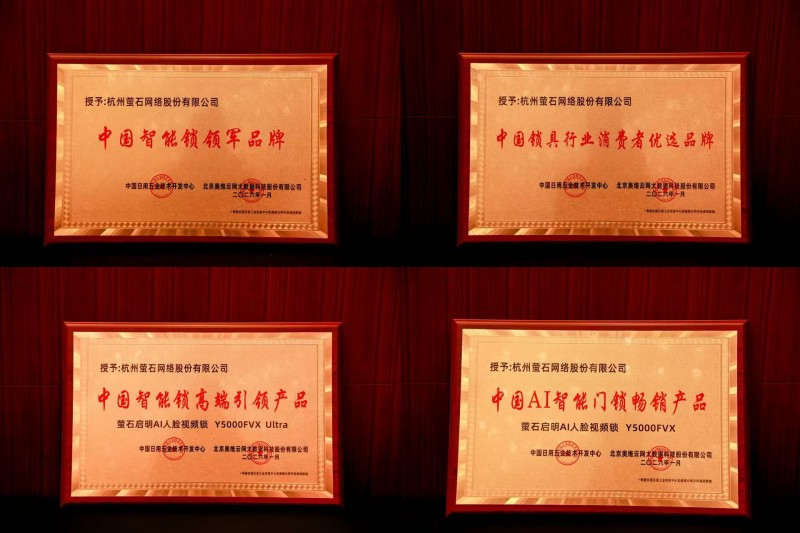 行业身份升级的同时,萤石迎来品牌与产品荣誉的双重丰收。品牌方面,萤石斩获由中国日用五金技术开发中心、奥维云网联合颁发的“中国智能锁领军品牌”与“中国锁具行业消费者优选品牌”两大品牌类殊荣。在产品类评选中,萤石启明Y5000FVX Ultra凭借突破性的技术创新,获评“中国智能锁高端引领产品”,热售型号Y5000FVX则以卓越的市场表现与优质的AI交互体验,荣获“中国AI智能门锁畅销产品”称号。