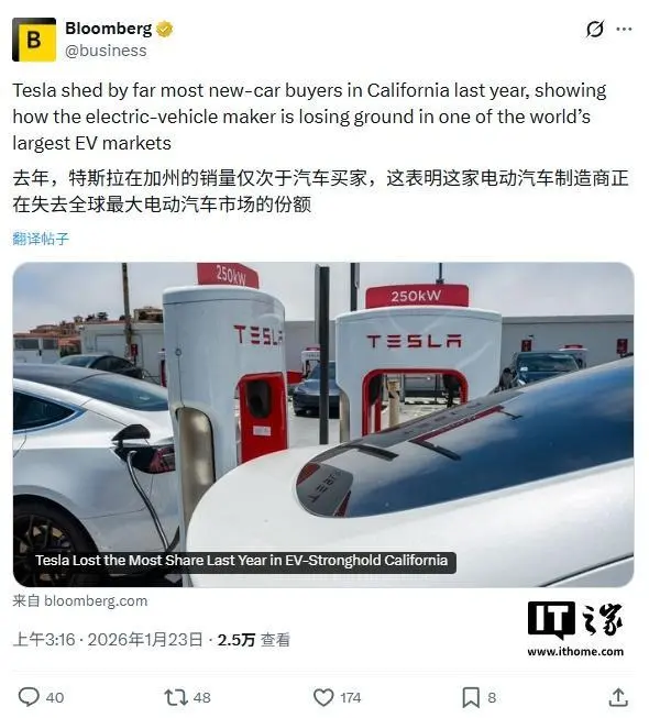 1 月 23 日消息,据彭博社今日报道,在特斯拉大本营,也是电动 渗透率长期位居美国前列的加利福尼亚州,特斯拉去年出现了明显的市场份额下滑。