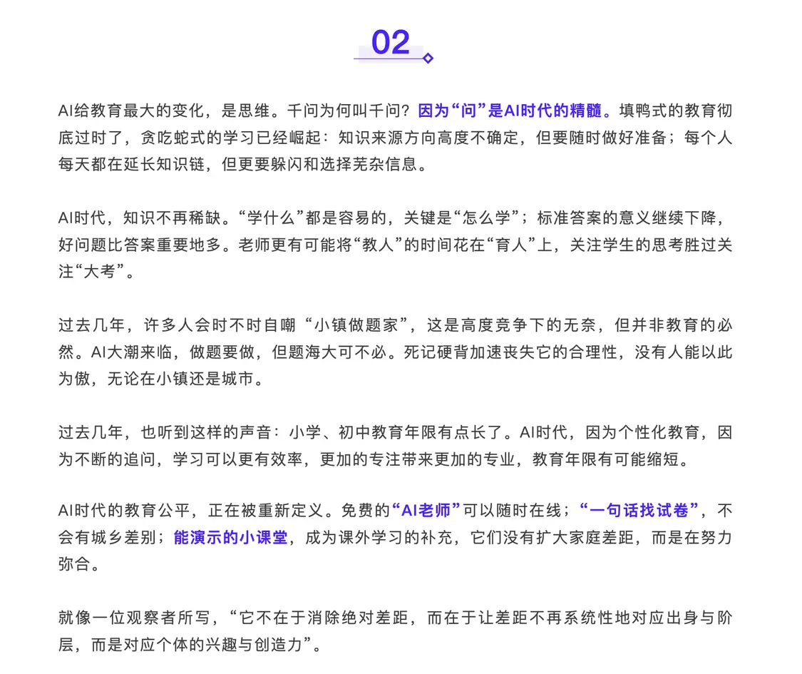 文章还认为,AI无法解决所有教育问题,其关键在于如何被合理使用。它可能拉齐学习的“起跑线”,但终身学习的“时间线”会被拉长;它可以辅助学习,但无法替代思考本身。教育的本质,最终仍将回归于人的全面成长。