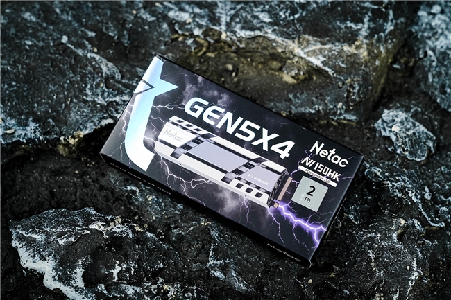 朗科绝影NV150HK固态硬盘的包装设计很炫酷,紫色的闪电划破夜空,与上方的GEN5x4强大性能相呼应,右侧是Natec朗科品牌标识和NV150HK产品型号,下方标签标注了2TB容量。