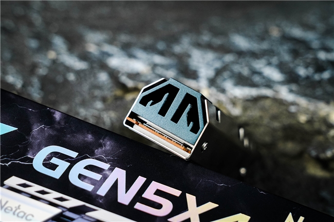 为了保障长时间、高负荷的稳定运行,朗科绝影NV150HK配备了高性能被动式散热器,不锈钢外框包裹铝合金散热片,中部整体采用磨砂质感的蓝绿色调,并有两条斜纹开口用于提升散热效率,左侧用CNC工艺加工成亮面,并用激光雕刻出Netac的品牌标识,视觉效果非常炫酷。