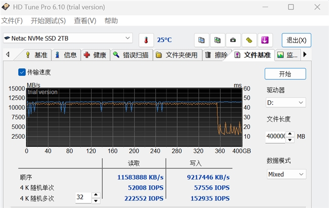为了提升消费级TLC/QLC固态硬盘的性能,行业普遍采用SLC缓存的策略。在HD Tune Pro中向朗科绝影NV150HK 2TB写入400GB数据,通过图形可以看到写入曲线基本平稳在11000MB/s,大约355GB时候似乎出现SLC缓存用尽迹象,但写入速度最低也接近3000MB/s。