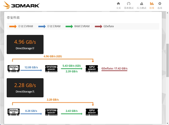 3DMARK DirectStorage功能是DirectX12 Ultimate的重要特性,它可以帮助PC更快的加载游戏,充分释放NVMe固态硬盘的潜力。实测启用DirectStorage之后,使用朗科绝影NV150HK 2TB速度是未开启之前的117.2%,进一步提升游戏的加载速度。