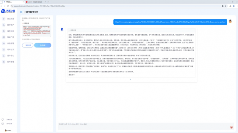 作为天禹 AI 在数智营销领域的全新落地成果,天禹小智账号分析功能直击行业痛点,区别于传统工具的基础数据呈现,该功能基于天禹数智专业矩阵 IP 分析逻辑,实现了从 “数据统计” 到 “策略输出” 的 升级,堪称 AI 时代的 “爆款显微镜”。天禹数智通过研究大量双平台头部账号发现,成功的自媒体账号均具备清晰的定位、可复制的选题模型、标准化的内容结构、精准的粉丝画像及明确的变现路径,而这些核心信息依靠人工难以完整拆解。此次上线的账号分析功能,只需创作者输入目标博主账号,数分钟内即可完成对账号成功内因的全维度拆解:智能识别赛道红利期并匹配行业赛道,拆解高赞内容的钩子公式与情绪节奏,分析顶流 IP 的人设标签库并提供差异化打造方案,同时提取已验证的账号变现组件,让爆款的核心逻辑变得清晰可触。