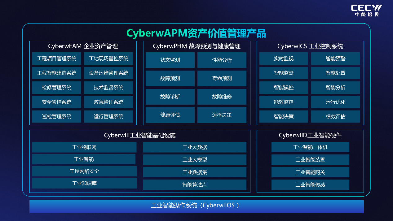 基于CyberwIIOS拾贝工业智能操作系统,聚焦APM领域完成了CyberwPHM、CyberwEAM、CyberwICS、CyberwIII、CyberwIID五大核心产品的全面提升。这不仅是单一产品的迭代,更是构建了覆盖“端侧硬件—边缘计算—平台软件—场景应用”的APM全栈产品体系,实现了从底层控制到上层决策的有机统一。