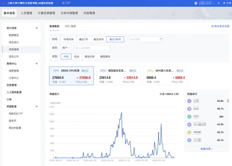 2025年秋季学期,三峡大学AI虚拟实验室算力资源消耗情况