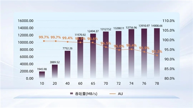在CosmoFlow场景的实际验证中,我们累计训练了971819个文本数据,并模拟了1至26颗GPU的训练过程。如图5所示,当加速器数量达到23及以上时,UH812a吞吐量稳定维持14000MB/s,同时GPU利用率始终高于基准要求(AU>70%,展现出卓越的系统可扩展性与持续稳定的高并发数据供给能力。
