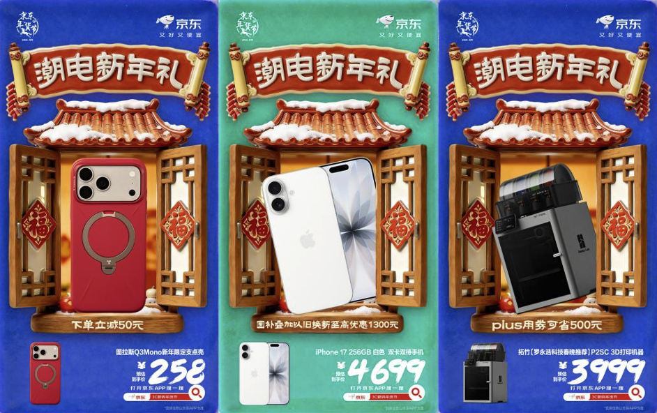 新年也是记录生活、表达心意的高频时刻。对于想换新手机的消费者,iPhone 17 256GB白色双卡双待机型可享国补叠加以旧换新至高优惠1300元,预估到手价4699元,在更实惠的价格区间实现新机焕新。配件方面,图拉斯Q3Mono新年限定支点壳下单立减50元,预估到手价258元,既能提升手机使用手感,也更适合作为节日氛围感拉满的“新年小礼物”。而对于喜欢尝试新科技、热衷动手创造的用户,可以选择罗永浩科技春晚推荐的拓竹P2SC 3D打印机,解锁更丰富的创作与生产方式,plus用户用券可省500元,预估到手价3999元,让更多消费者用更低门槛感受“科技改变生活”的乐趣。