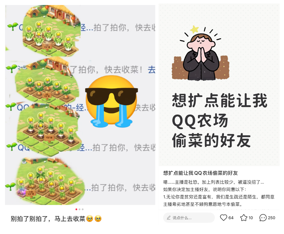 更有农场玩家,玩的可不止是偷菜,更是花式整活!偷菜互助群里,大家实时共享 “偷菜情报”——谁的菜熟了、谁家的狗不咬人;玩家们还自发开启二创狂欢,农场截图做成搞怪表情包,“偷菜被狗咬”“一键收菜爽到飞起” 的梗图在群里传疯;捡手机文学、农场小剧场接连上线,“你的竹马是个爱玩QQ农场的笨蛋” 这类趣味内容在社交平台上收获了很高的互动。
