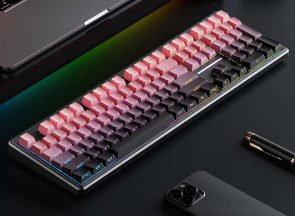 背光系统方面,V108提供多种亮度和模式调节,方便在光线不足环境下使用。连接方式上,它提供有线、2.4G无线以及蓝牙三模连接,稳定性强,延迟极低,适合对输入实时性要求高的工作场景。作为系列中的旗舰型号,V108在材质和做工上也较为扎实,适合追求长期稳定使用的用户。