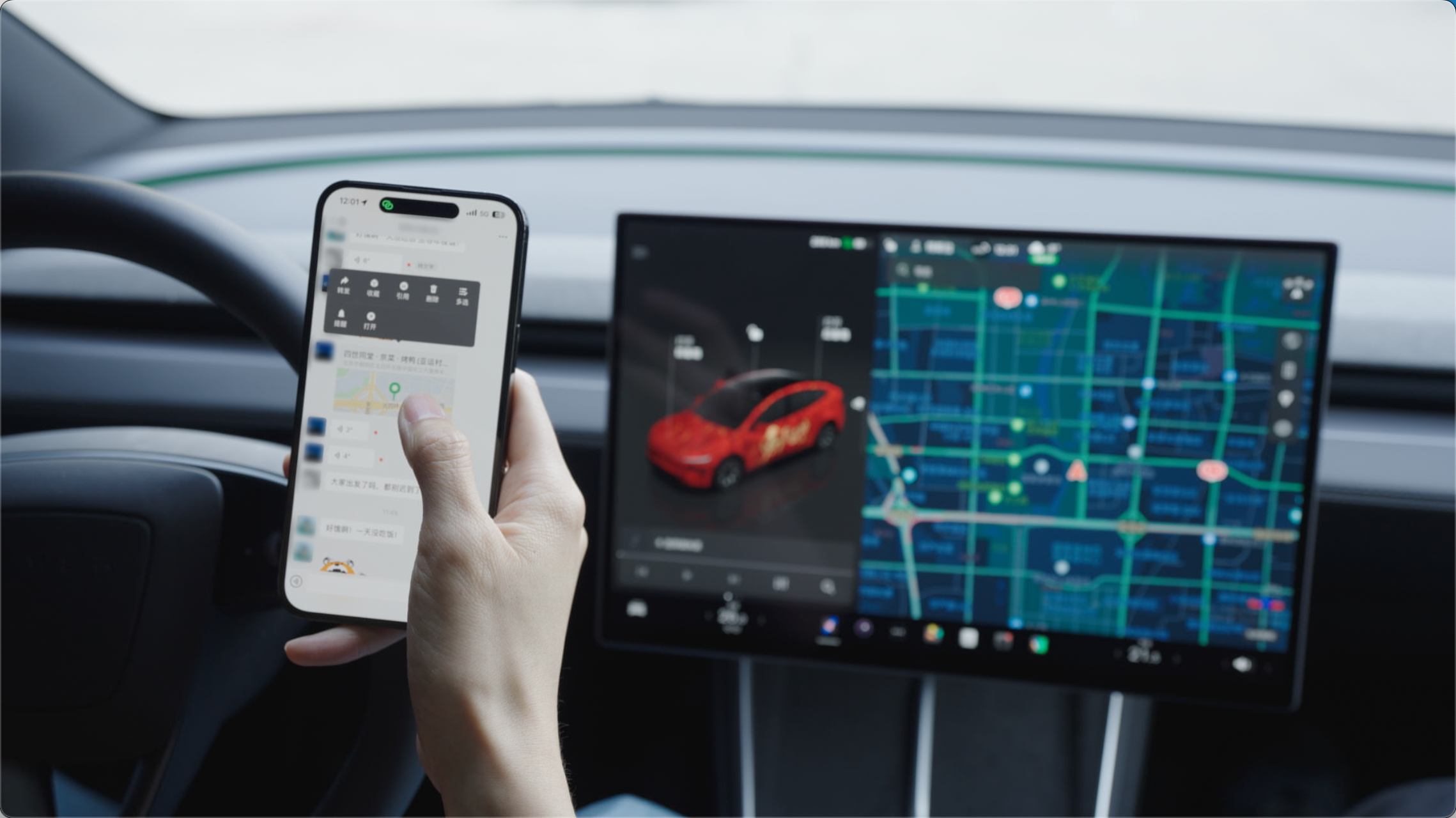 微信互联功能基于腾讯随行互连能力,打通手机与车机间的位置流转。用户可将微信对话中的位置卡片,或来自腾讯地图、百度地图、高德地图等多种来源的POI信息,一键分享至特斯拉车机并直接发起导航。