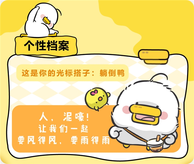 「光标搭子」的核心魅力,在于其丰富的个性化与拟人化互动。启用后,屏幕上的光标将告别千篇一律的闪烁竖线,化身为一系列灵动鲜活的可爱IP:它可能是一只“躺平”说话的鸭子,透露着萌力和幽默感;也可能是一只古灵精怪的小黑猫,在字里行间轻盈跳跃;或是一只慵懒软萌的小羊,静静陪伴深夜emo;还是充满想象力的卡通蒜鸟、来自未知星球的外星小猫……多样化的光标搭子赋予了输入过程全新的体验。