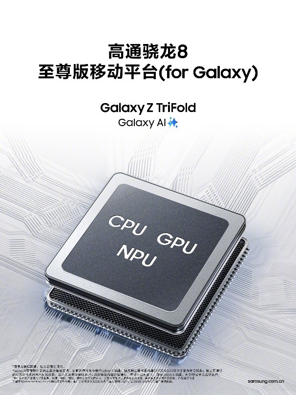 此外,作为一款超高端折叠设备,三星Galaxy Z TriFold也少不了旗舰级别的硬件配置。其搭载了骁龙8至尊版移动平台(for Galaxy),为系统的稳定流畅运行提供了强劲的支持。内屏、外屏均使用第二代动态AMOLED屏幕,拥有超高分辨率和峰值亮度,无论是办公、观影,还是游戏,都能让用户享受到震撼的视觉效果。内置的5600毫安时(典型值)三电芯电池系统,配合45W超级加速充电,也为三星Galaxy Z TriFold带来了更持久的续航。
