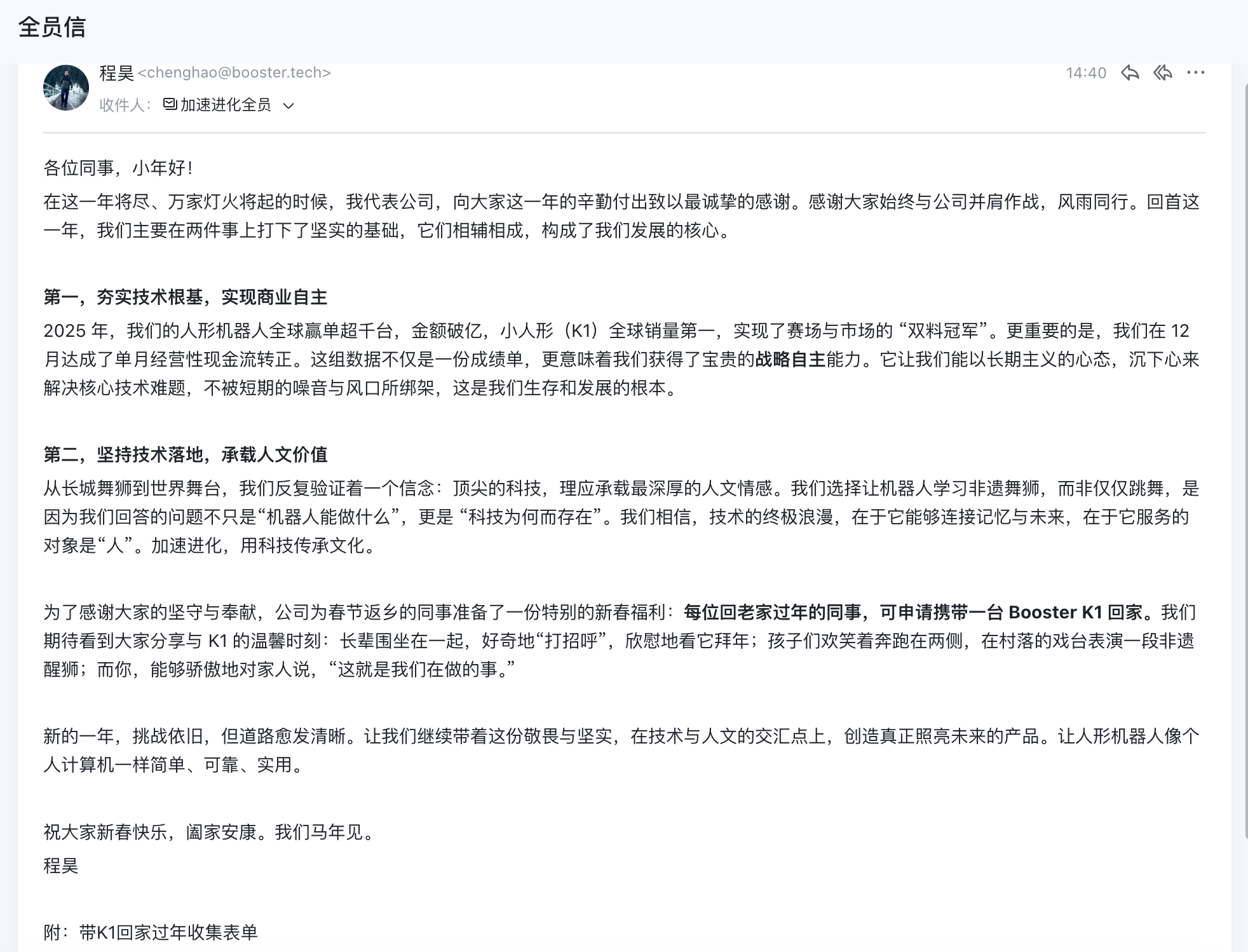 在技术落地与人文融合上,公司以机器人演绎非遗醒狮,从长城走向全球舞台,践行“科技传承文化”的理念,探索技术与人的价值连接。值得注意的是, 为回馈员工,加速进化推出专属新春福利:春节返乡员工可申请携带Booster K1回家,让科技成果走进家庭。