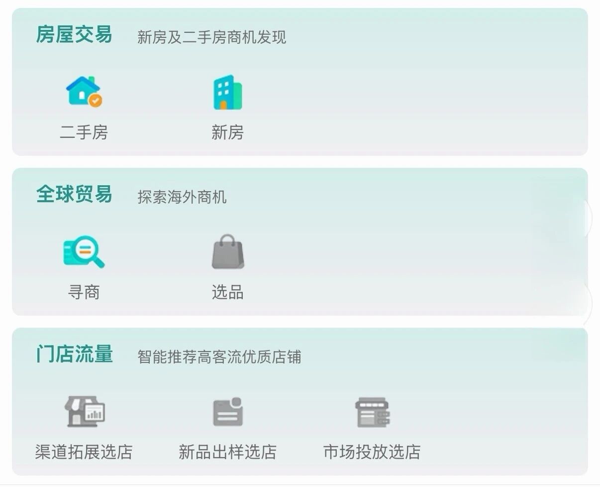 数据罗盘小程序同时还包含三大营销工具类数据,分别是:房屋交易数据、全球贸易数据、门店流量数据。这些数据工具可以帮助各行各业在相关领域实战赋能。