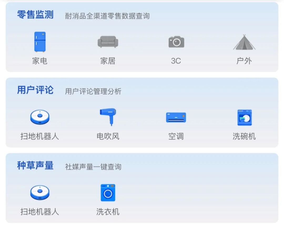 升级:数据全面扩容,覆盖全域营销场景。奥维数据罗盘小程序实现三大维度全面扩容。在数据品类上,从单一家电领域,拓展至家电、家居、3C数码、户外运动四大领域,实现跨品类数据覆盖;在数据范围上,突破国内市场局限,延伸至全球范围,助力企业开拓海外商机;在数据链路上,从结果数据向前端线索数据、到客数据、营销数据,到后期效果数据,全链路数据覆盖,形成完整数据闭环。