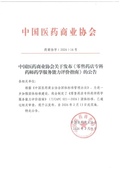 近日,T/CAPC 021—2026《零售药店专科药师药学服务能力评价指南》团体标准正式发布,这是我国零售药店领域首部针对专科药师药学服务能力的系统性评价文件,填补了行业标准空白。