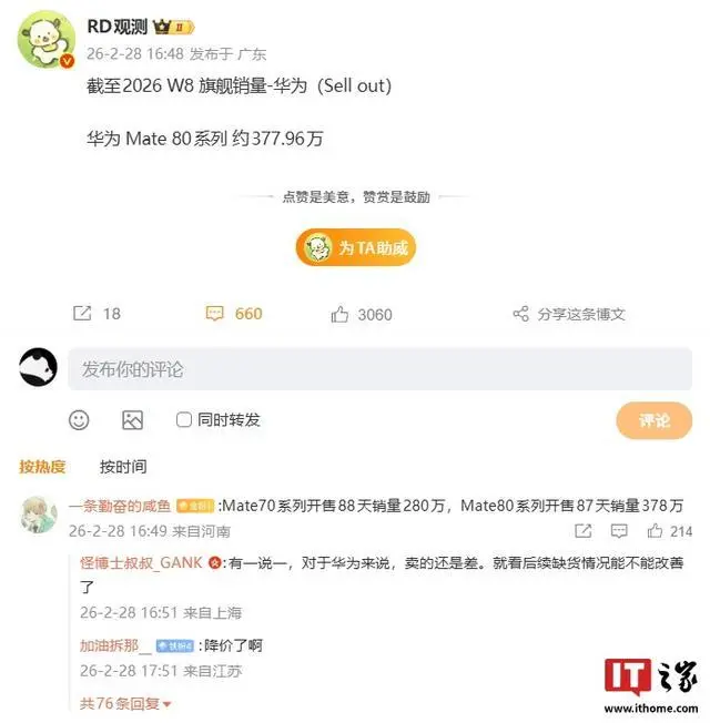 3 月 1 日消息,长期关注国内手机市场份额的博主 @RD观测 昨日公布了华为旗舰手机的销量:截至 2026 W8(IT之家注:第八周),华为 Mate 80 系列约 377.96 万台,已逼近 400 万大关。