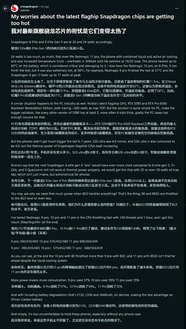 IT之家注意到,Reddit 用户“sseinzw”发起的讨论指出,由于高通没有限制芯片运行频率,骁龙 8 Elite Gen 6 Pro 将会发热严重、难以控制。他举例称,骁龙 8 Elite Gen 5 的功耗已能达到 20W~24W,这已经是轻薄本处理器的功耗水平。