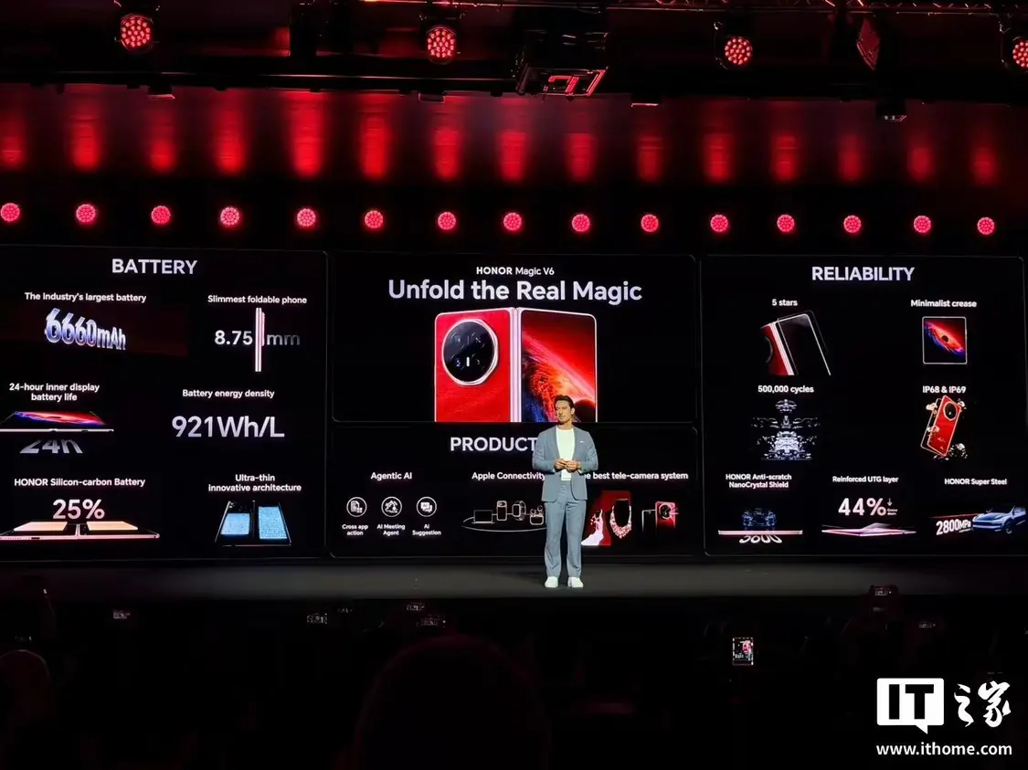荣耀 Magic V6 搭载第五代高通骁龙 8 至尊版芯片,采用超轻薄荣耀鲁班架构,内置 6660mAh 电池,白色版本整机仅重 219g(其他 224g),折叠后仅厚 8.75mm(展开 4.0mm)挑战业内最薄(其他 9.0mm/4.1mm)。