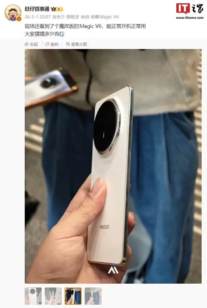 3 月 2 日消息,据博主 @旺仔百事通 分享,在昨晚荣耀发布会现场还出现了一款魔改版的 Magic V6 机型。