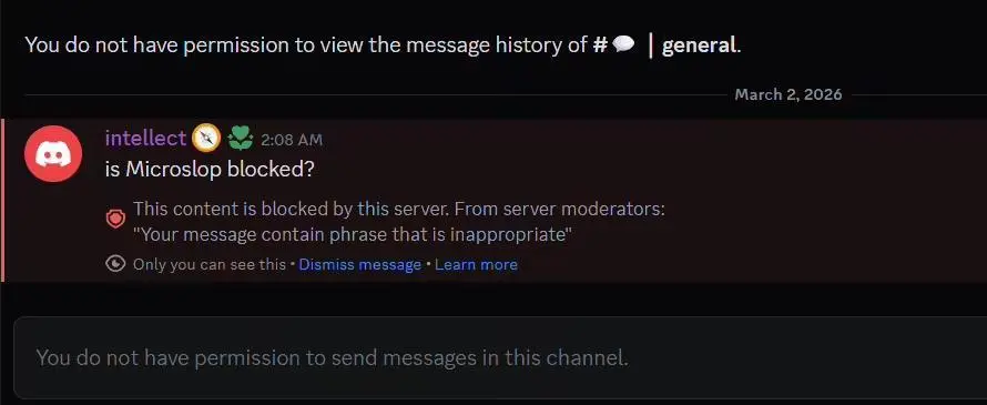 微软官方Discord频道封禁网友自造词“Microslop”未果,竟选择大面积“禁言”