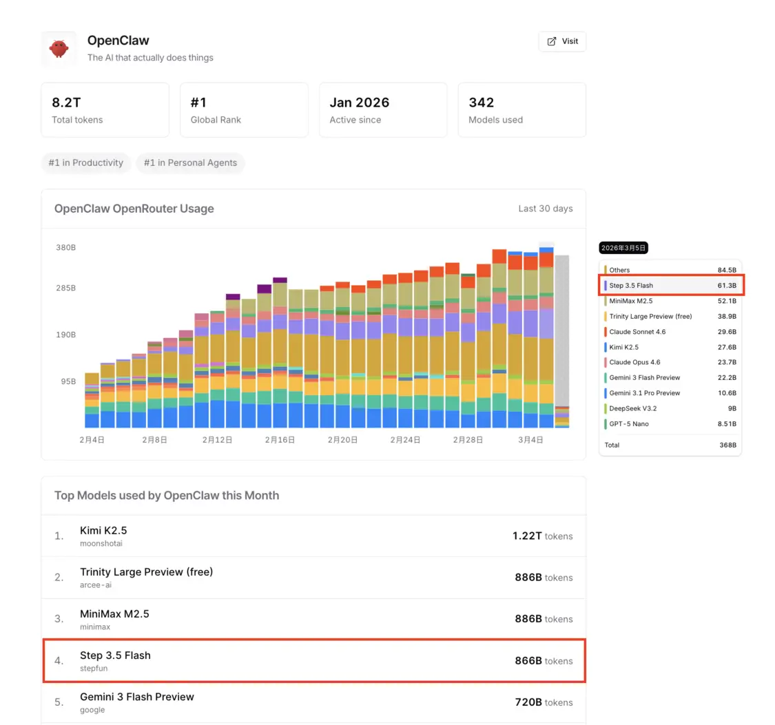 3月6日,近日,阶跃星辰全面开源新一代基座模型Step 3.5 Flash。截至3月6日,该模型在OpenClaw(被网友称为“小龙虾”的全球知名开源项目)平台上的调用量连续两日位居全球第一。