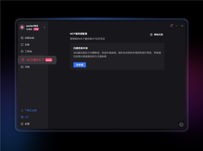 如需体验向日葵MCP Server功能,目前可搜索 “贝锐向日葵”进入官网,下载最新个人Beta版本,并在向日葵客户端申请加入内测。