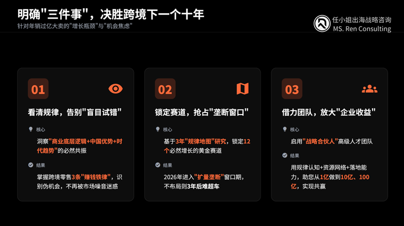 任小姐出海战略咨询现已开放《你的跨境业务与12大赛道适配诊断表》的预约。如果您正寻求机会诊断或战略定制,欢迎关注公众号:任小姐出海战略咨询,联系官方客服,与我们聊聊“哪个赛道机会能让您的企业明年多赚5000万”,共同在2026年的黄金赛道上,顺势深耕,必然增长。
