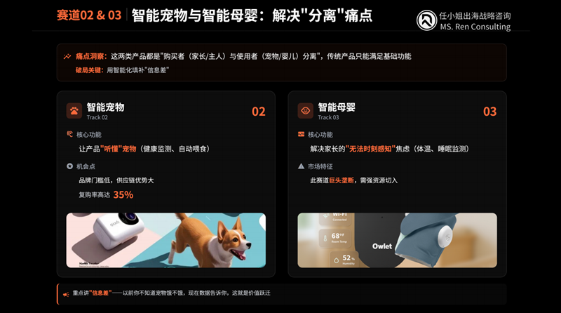 2.层次2:传统品类产研革新。 通过智能化、科技化改造传统红海品类。例如,智能宠物与智能母婴利用传感器解决“购买者-使用者分离”的信息差;科技大健康则用“物理干预替代药物”,将理疗产品全面智能化。