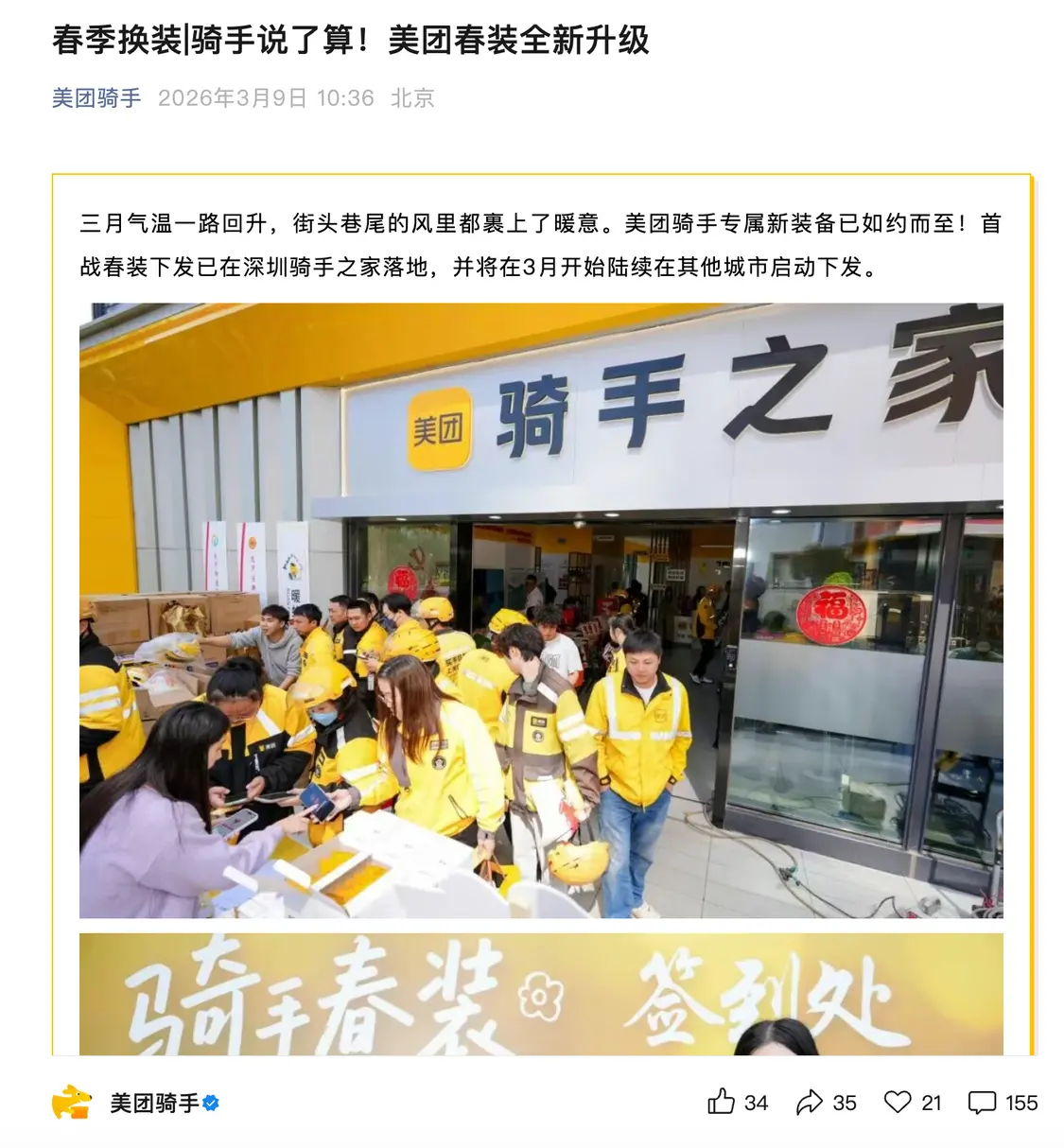 3月9日,美团官方宣布骑手服春装升级,已在深圳骑手之家落地下发,并将在3月开始陆续在其他城市启动下发。值得注意的是,此次升级美团推出行业首款由女骑手建议改款、定制的骑手服。