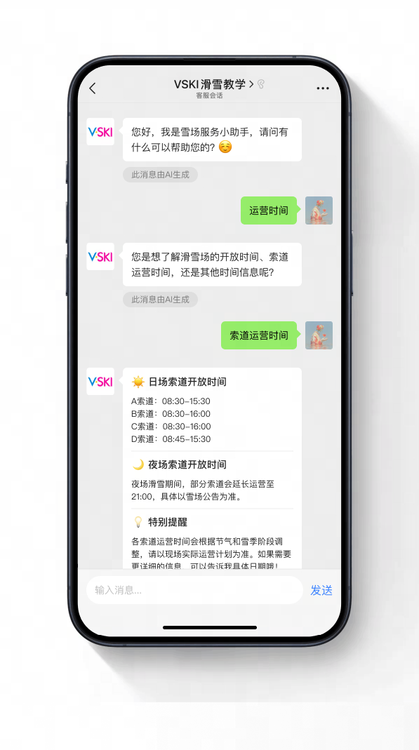 2025年,中旅冰雪正式引入客服Agent,率先在三个雪场“上岗”:内蒙古马鬃山滑雪场、承德金山岭银河滑雪场、中旅松花湖度假区,并成功部署在微信公众号、小红书、小程序、抖音等游客咨询集中的渠道。