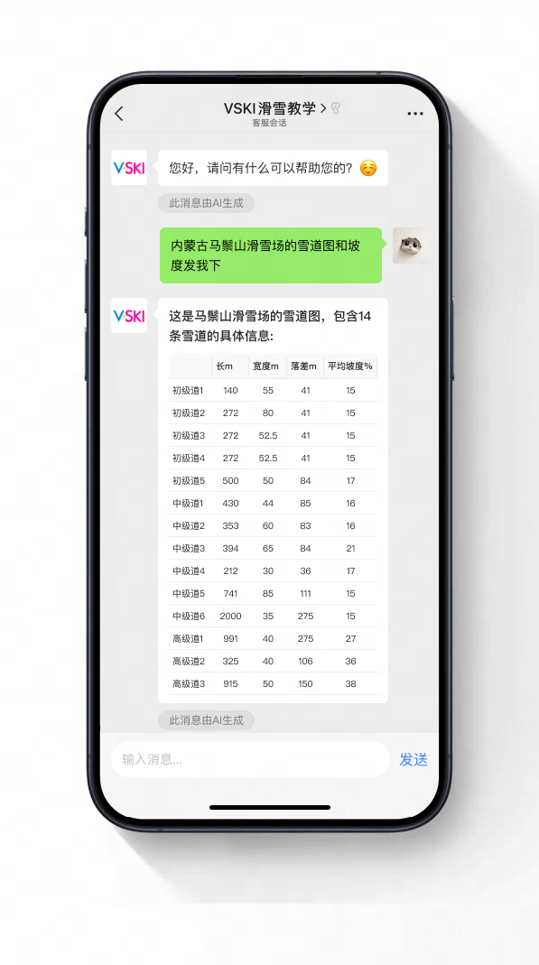 面对一位资深游客发来的专业问题“请把雪道图和坡度发我下”,客服Agent不仅没有被难倒,还快速把14条雪道的长、宽、落差、平均坡度清晰梳理在一张表格中进行回复。