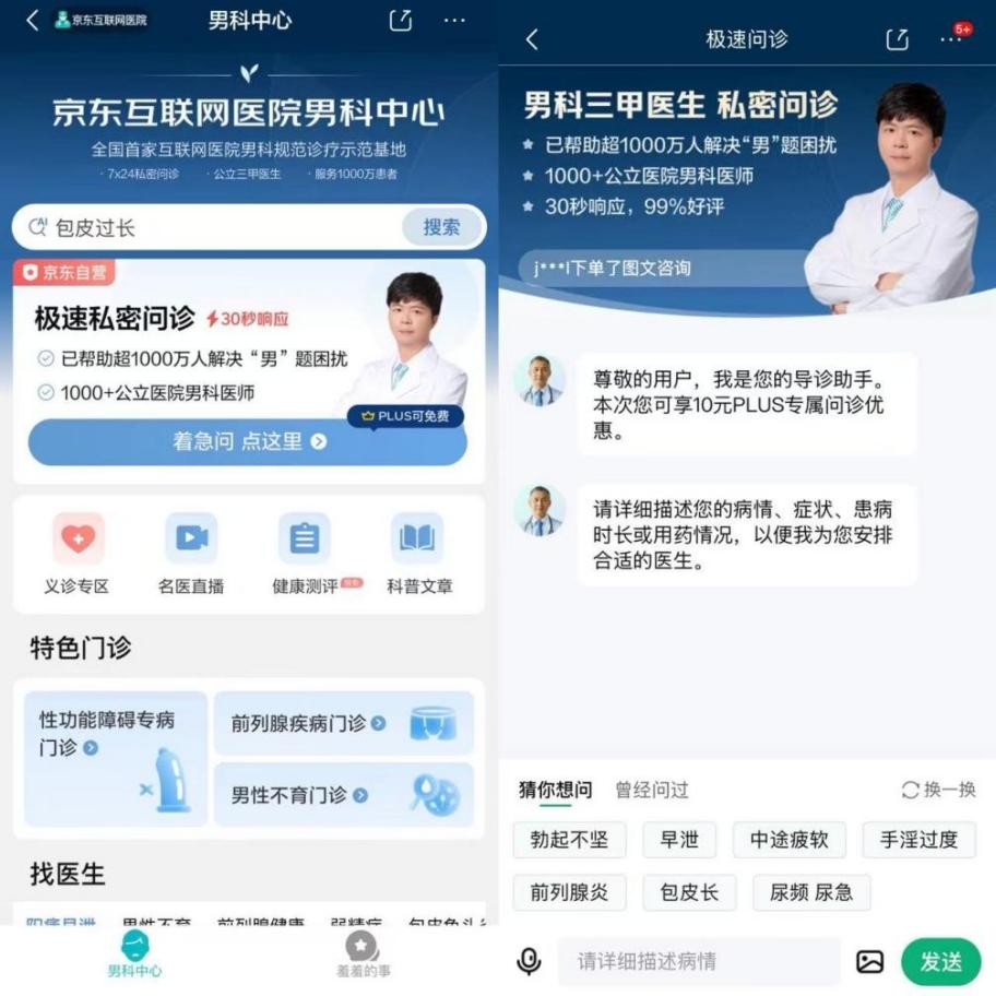 用户在京东 APP 首页搜索“男科中心”,即可直达问诊页面,享受隐私、便捷、专业的男科诊疗服务。未来,京东互联网医院男科中心将持续探索专病互联网医疗服务模式创新,推动预防、治疗、康复一体化发展,让每一位有需求的男性患者都能便捷、安心地获得权威诊疗与用药支持。