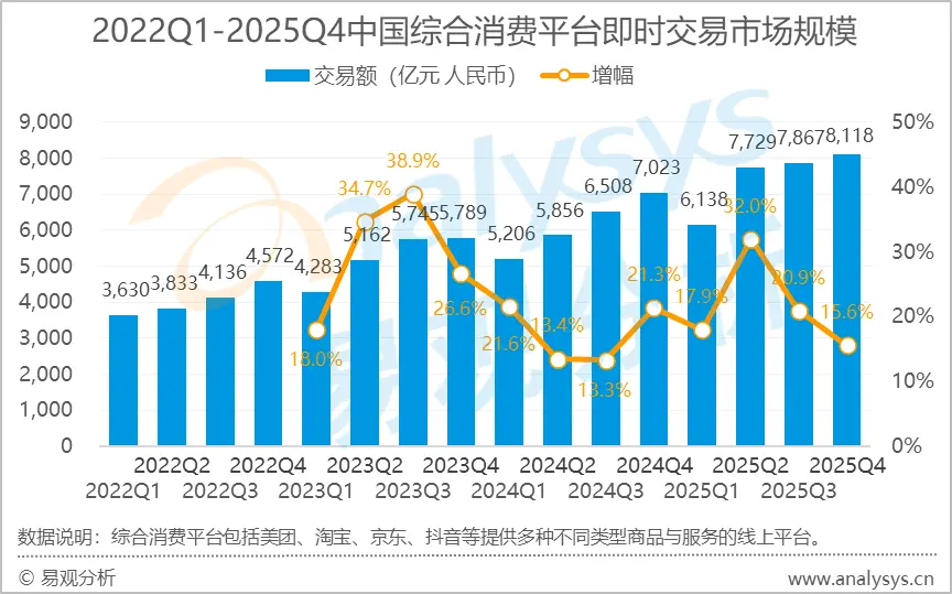 报告显示,2025年中国综合消费平台即时交易市场规模达到29852亿元,同比增长21.4%;其中2025年第四季度市场规模为8118亿元,同比增长15.6%,行业整体保持较快增长。报告分析认为,2025年第四季度,尽管进入秋冬季后饮料等外卖需求有所回落,但随着“双11”购物季的到来,促销热潮从传统电商延伸至即时交易场景,支撑了整体市场规模维持在较高水平。