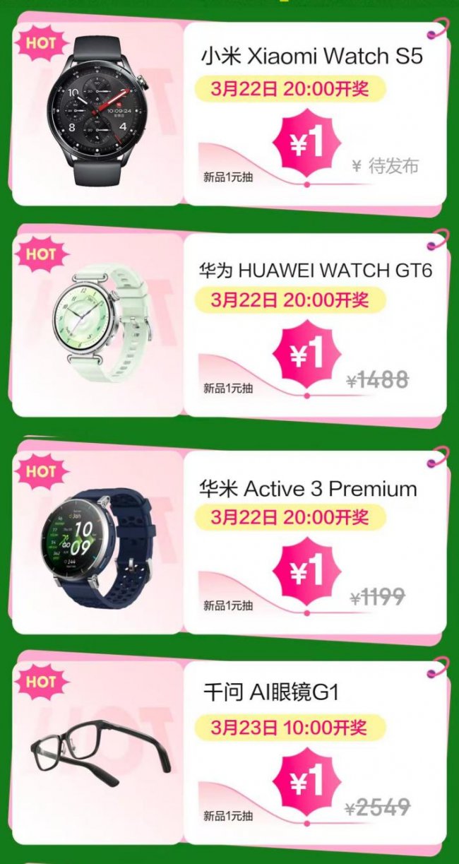 当晚20点,抽签活动再次升温,聚焦智能手表领域的年度新品与高端旗舰款,小米Xiaomi Watch S5率先释放新品热度,同时用户还有机会参与抽取华为WATCH GT6、华米Active 3 Premium等产品,实现从专业运动训练到日常精细化健康管理的全场景覆盖。3月23日10点,活动进入收官阶段,千问AI眼镜G1压轴登场,将“1元抽高价值智能设备”的参与氛围推向高潮。