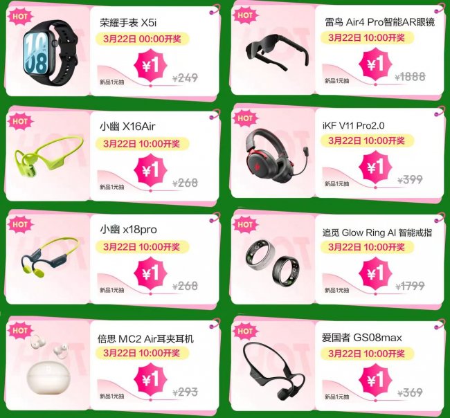 作为本次活动的重要亮点,“手表耳机1元抽”以分时段开奖的形式持续放送重磅产品,强化互动参与感与用户粘性。3月22日0点,荣耀手表X5i率先开启抽签,用户仅需1元即可参与抽取价值249元的智能手表。当天上午10点迎来首轮集中爆发,小幽X16 Air与X18 Pro分别以轻量佩戴与长续航表现覆盖轻运动与进阶训练场景,倍思MC2 Air耳夹耳机兼顾通勤与潮流出行需求,爱国者GS08max则针对跑步、骑行及游泳等运动场景优化佩戴稳定性与安全性。同时,多款前沿科技产品同步加入阵容,包括具备全天候健康监测能力的追觅Glow Ring AI智能戒指、强化沉浸音效体验的iKF V11 Pro 2.0,以及带来随时随地大屏体验的雷鸟Air4 Pro智能AR眼镜,进一步拓展运动与科技融合的应用边界。