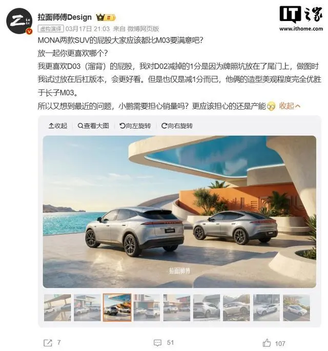 从图中可以看到,这款新车采用了小鹏 MONA M03 同款前脸设计,大灯造型非常明显一脉相承,配有半隐藏式门把手,尾部溜背造型。博主 @拉面师傅Design 表示,MONA D03 不会是 M03 无聊拉高。
