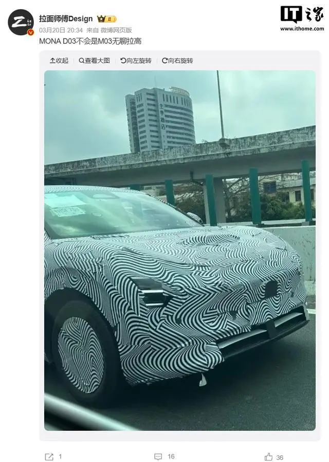 3 月 23 日消息,小鹏 MONA 系列首款 SUV 车型今日在网上曝光了谍照,多位博主称这款车命名可能是 MONA D03,是一款轿跑 SUV。