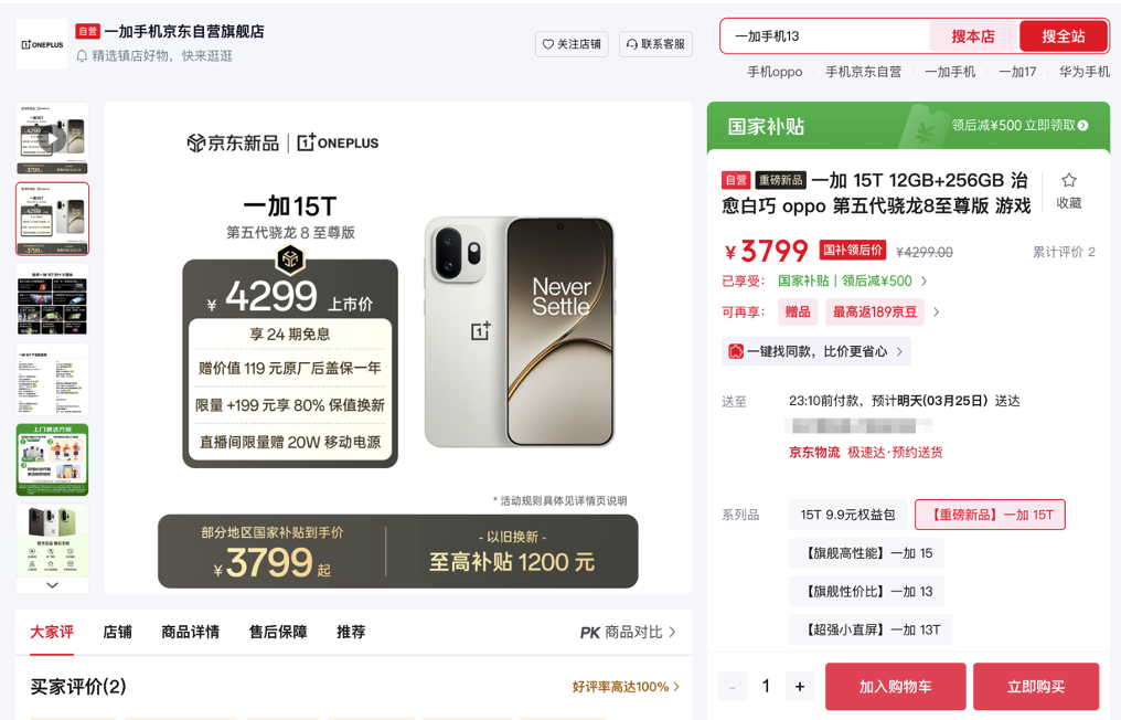 3月24日,备受瞩目的一加15T全新一代小屏旗舰正式发布,售价4299元起,国补后3799元起,并将于3月25日10点正式开售。京东携手一加打造先人一步加速换新计划,购买16+512GB版本可享限量现货优先发货,最快发布会当日送达,并限量赠送京东PLUS年卡。首销在京东下单一加15T还可购买9.9元专属权益包,一年全保修+一年延长保或OPPO Enco R4蓝牙耳机,两项权益可任选一项。目前,京东已同步开启预售,下单即享24期免息、以旧换新至高补贴1200元、赠价值119元原厂后盖保障一年、加199元享80%保值换新、加199元享一加40W超级冰点磁吸散热器等多项专属权益。